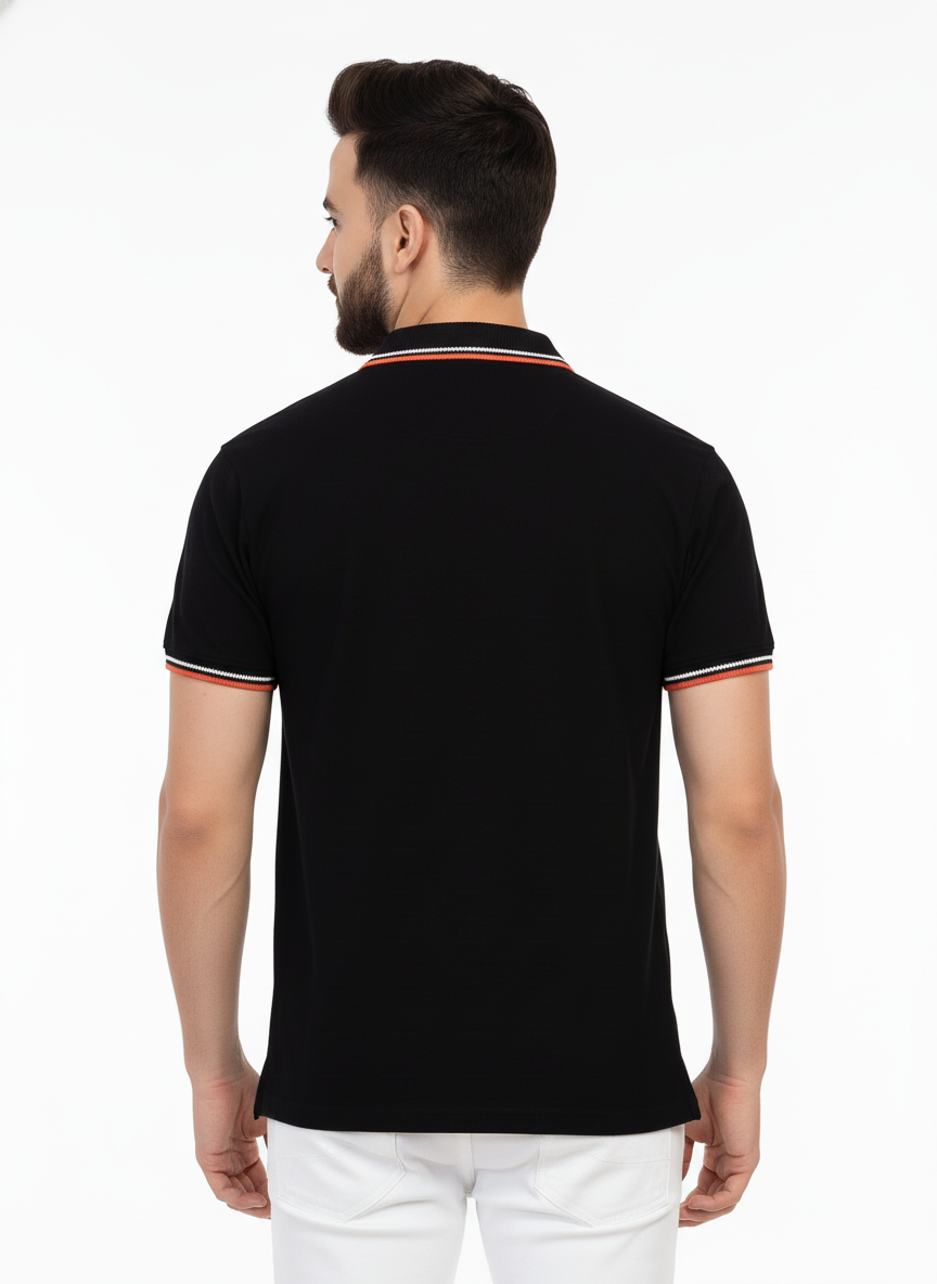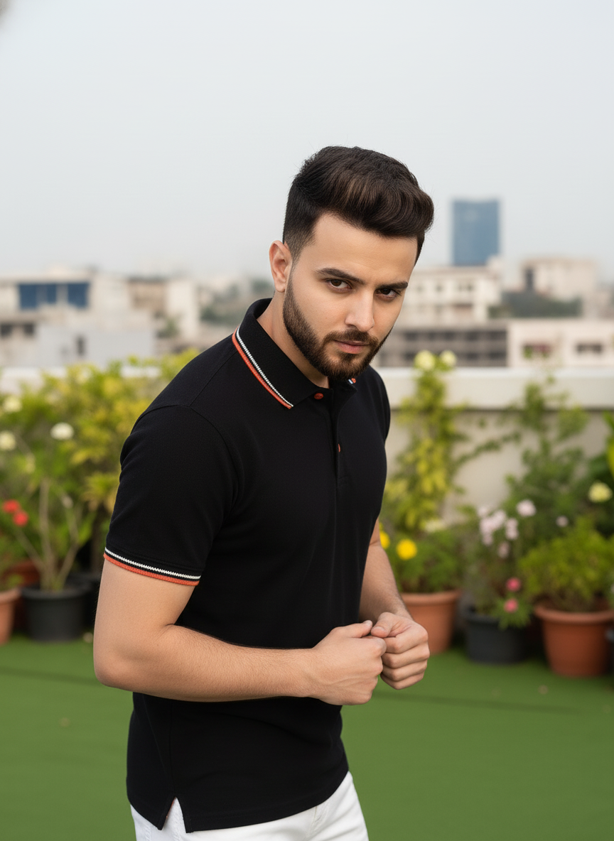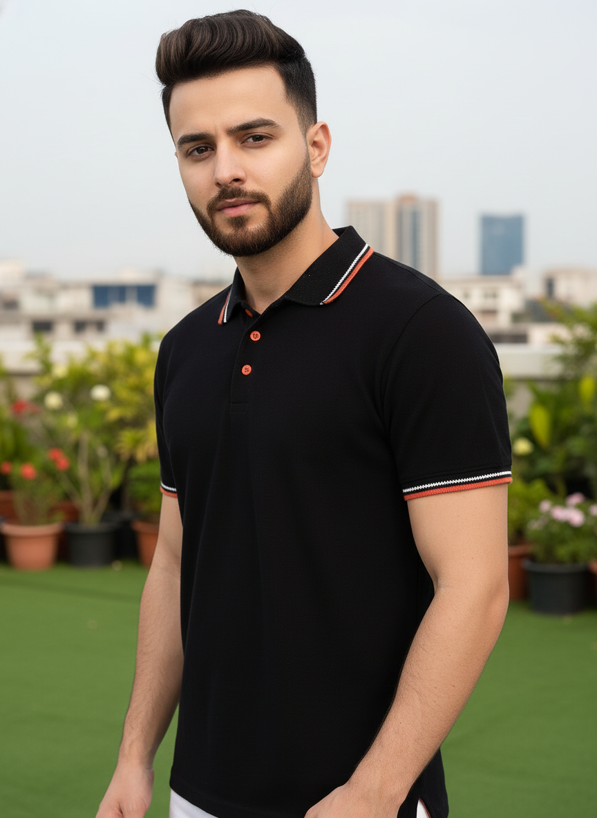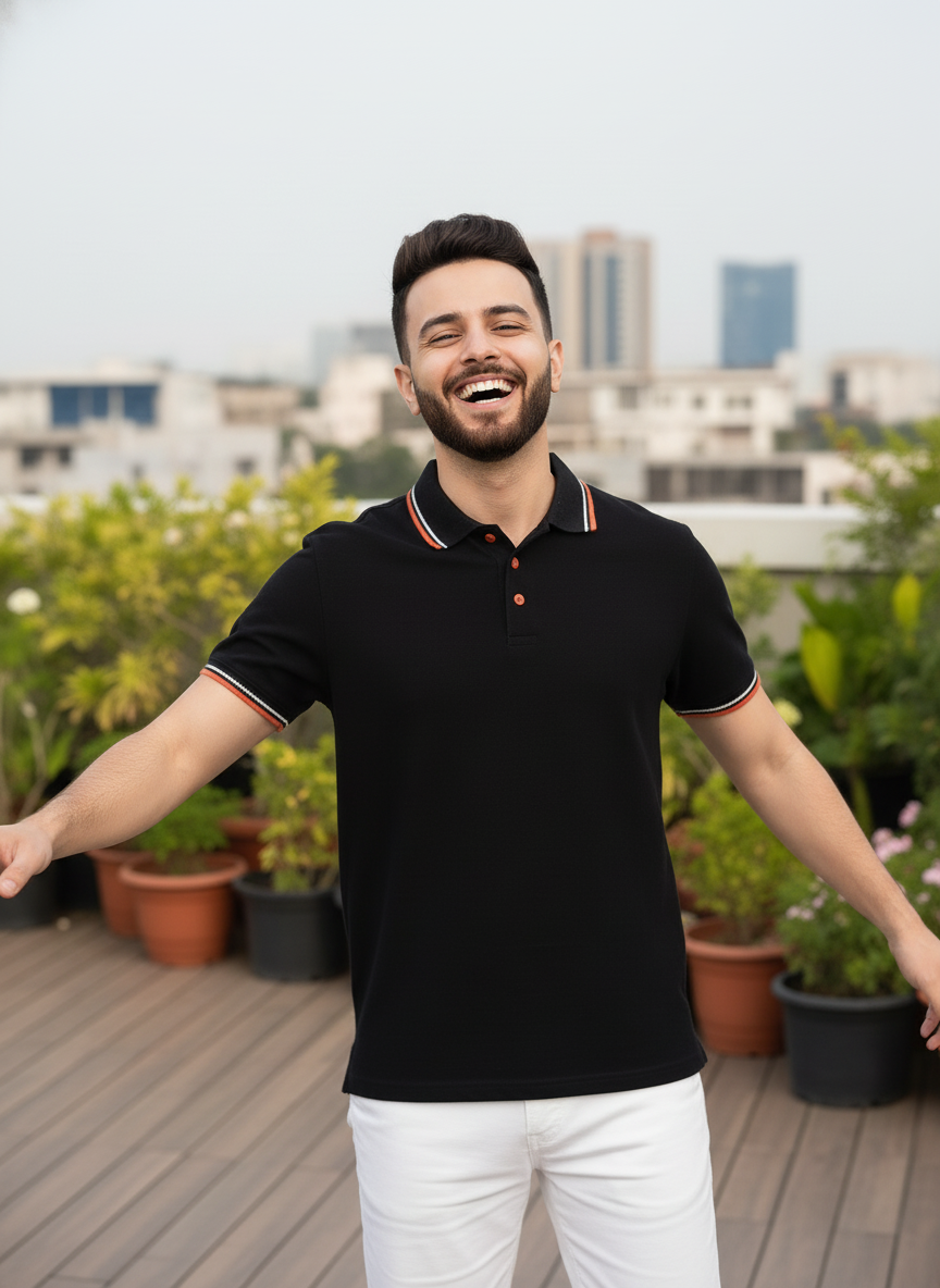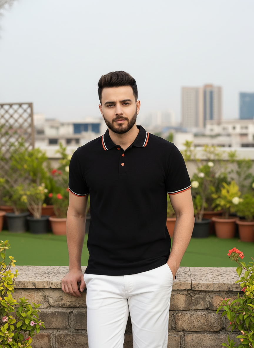 This black polo tshirt for men comes with a slim yet comfortable fit that enhances your natural shape. The sleek black color pairs perfectly with white pants, denim, chinos, or shorts. Whether you’re traveling, attending casual meetings, or going for an evening outing, this polo boosts your style instantly.