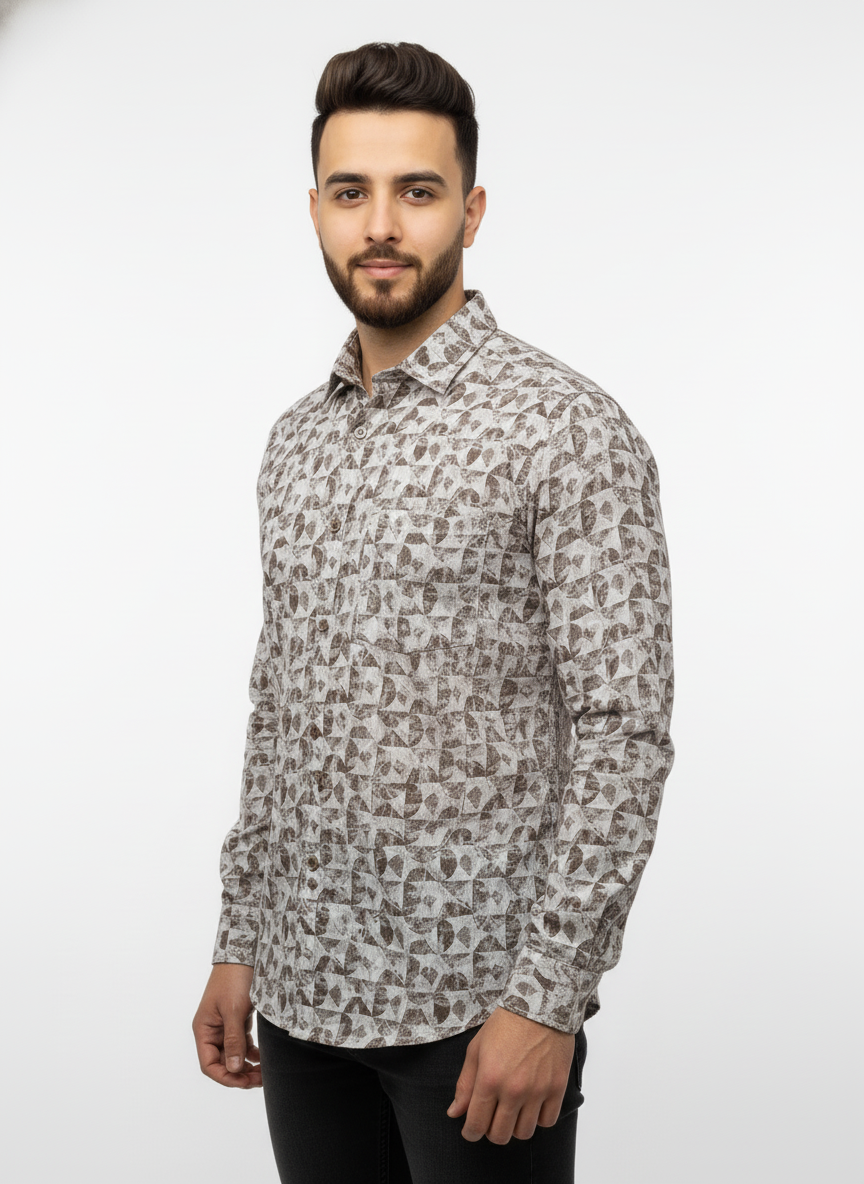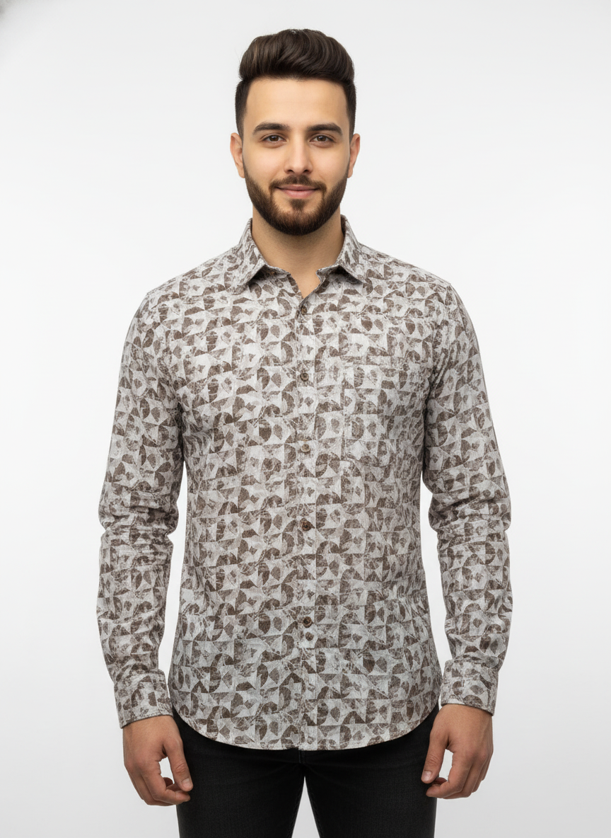PSI Men’s Beige & Brown Geometric Printed Full Sleeve Casual Shirt