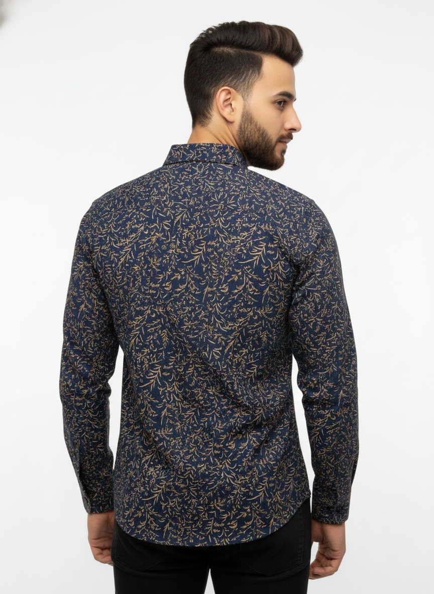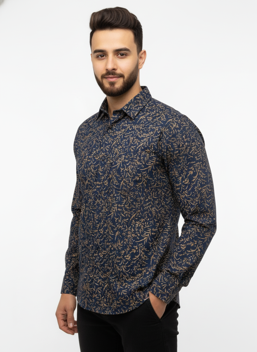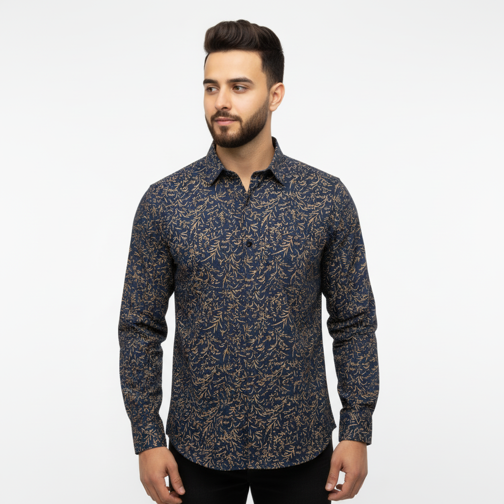 Blue Leafy Floral Cotton Shirt – Elegant Casualwear for Men
