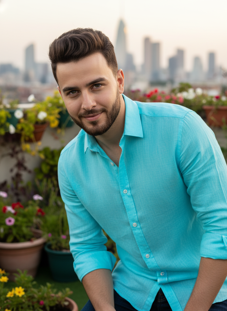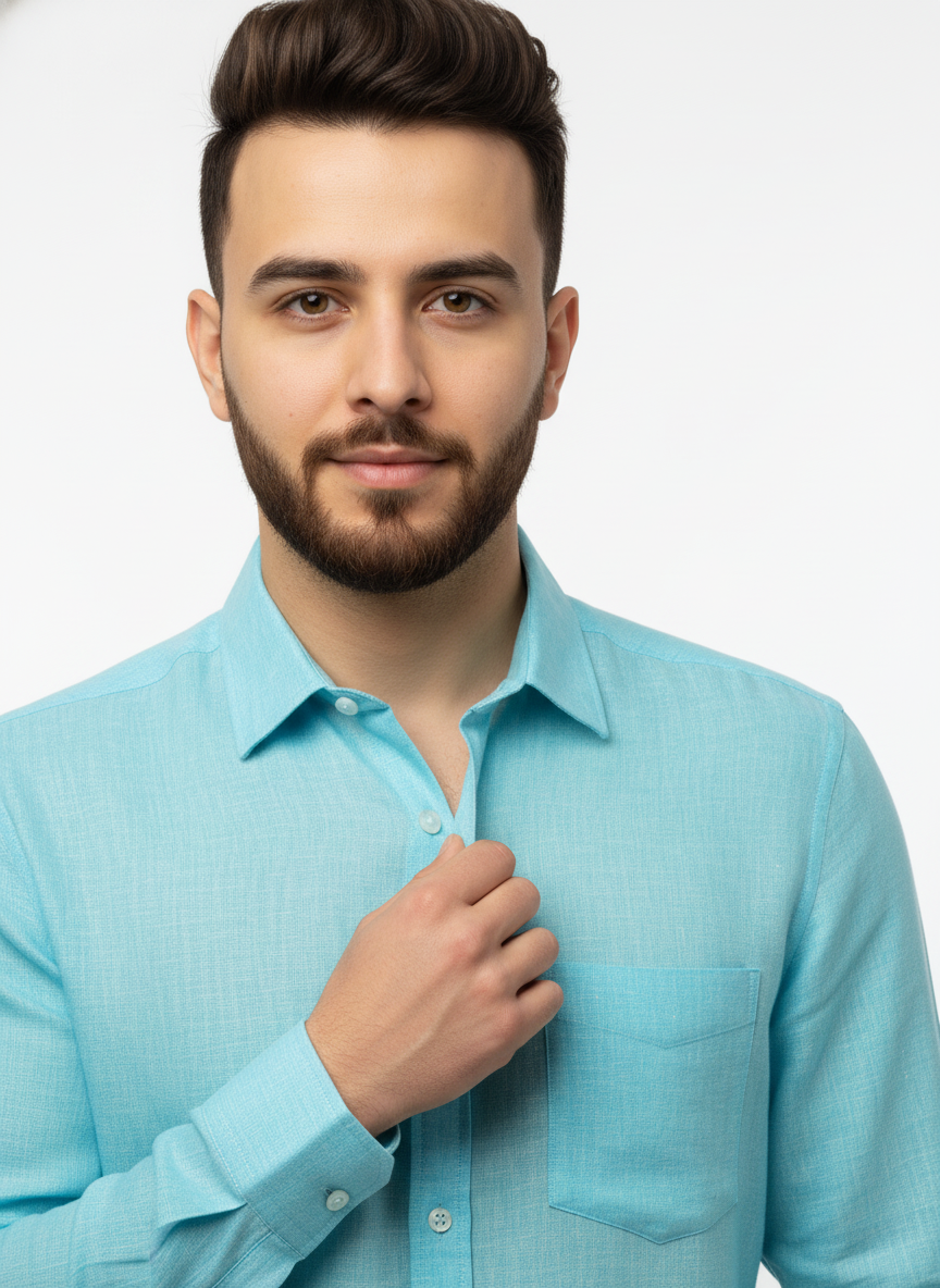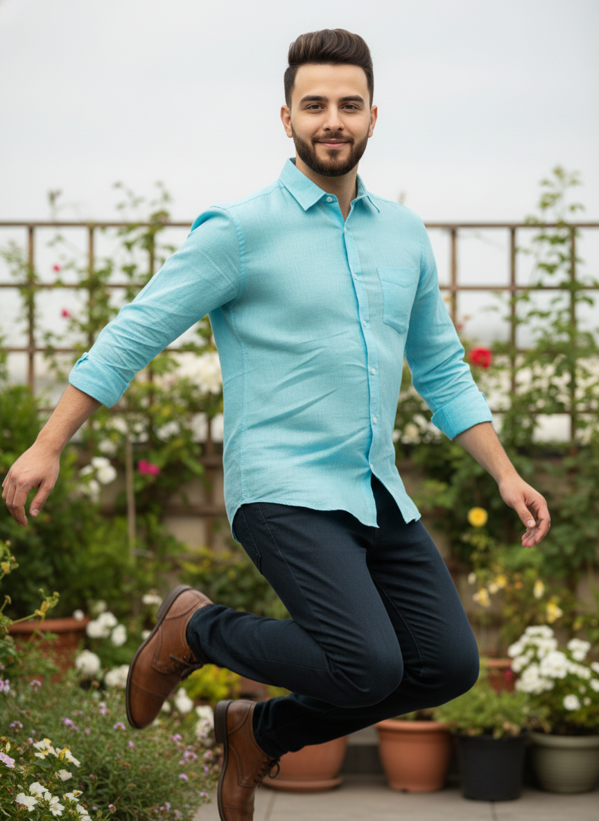 You can style this sky blue linen shirt men’s outfit with beige chinos, brown trousers, navy jeans, or white pants. The color stays fresh and elegant, which makes it suitable for office meetings, weekend outings, festive gatherings, and travel. Because of its soft pastel tone, the shirt adds a simple yet classy touch to any look.