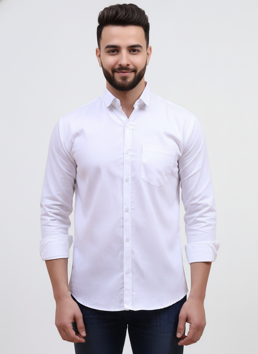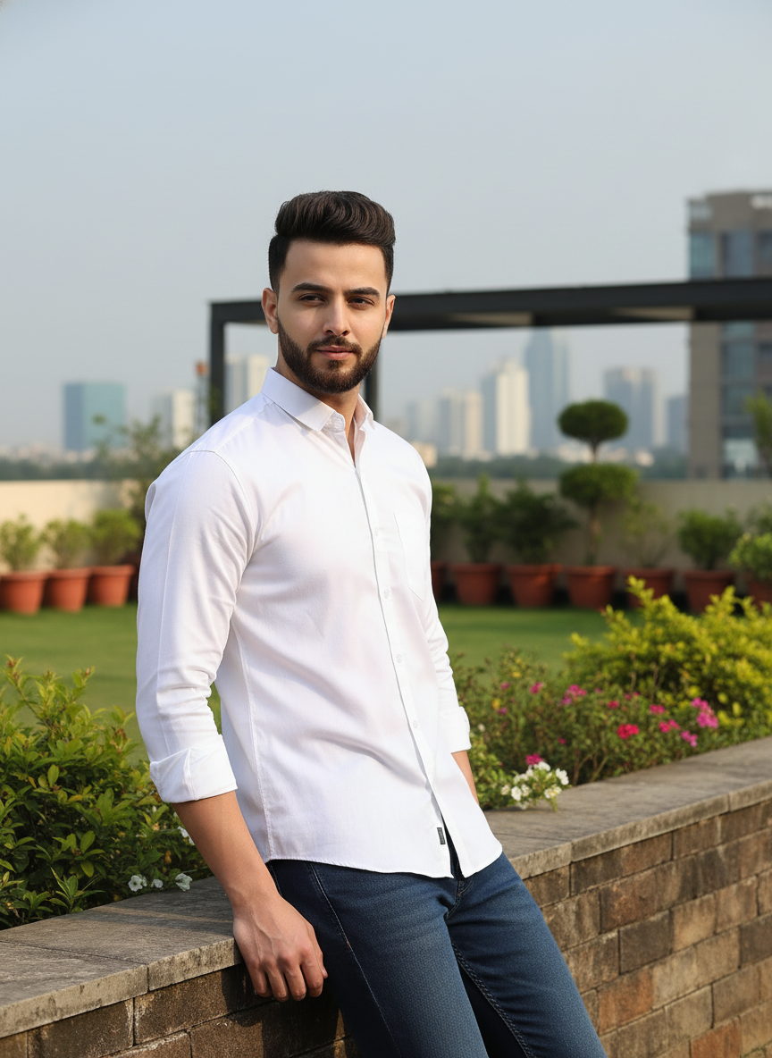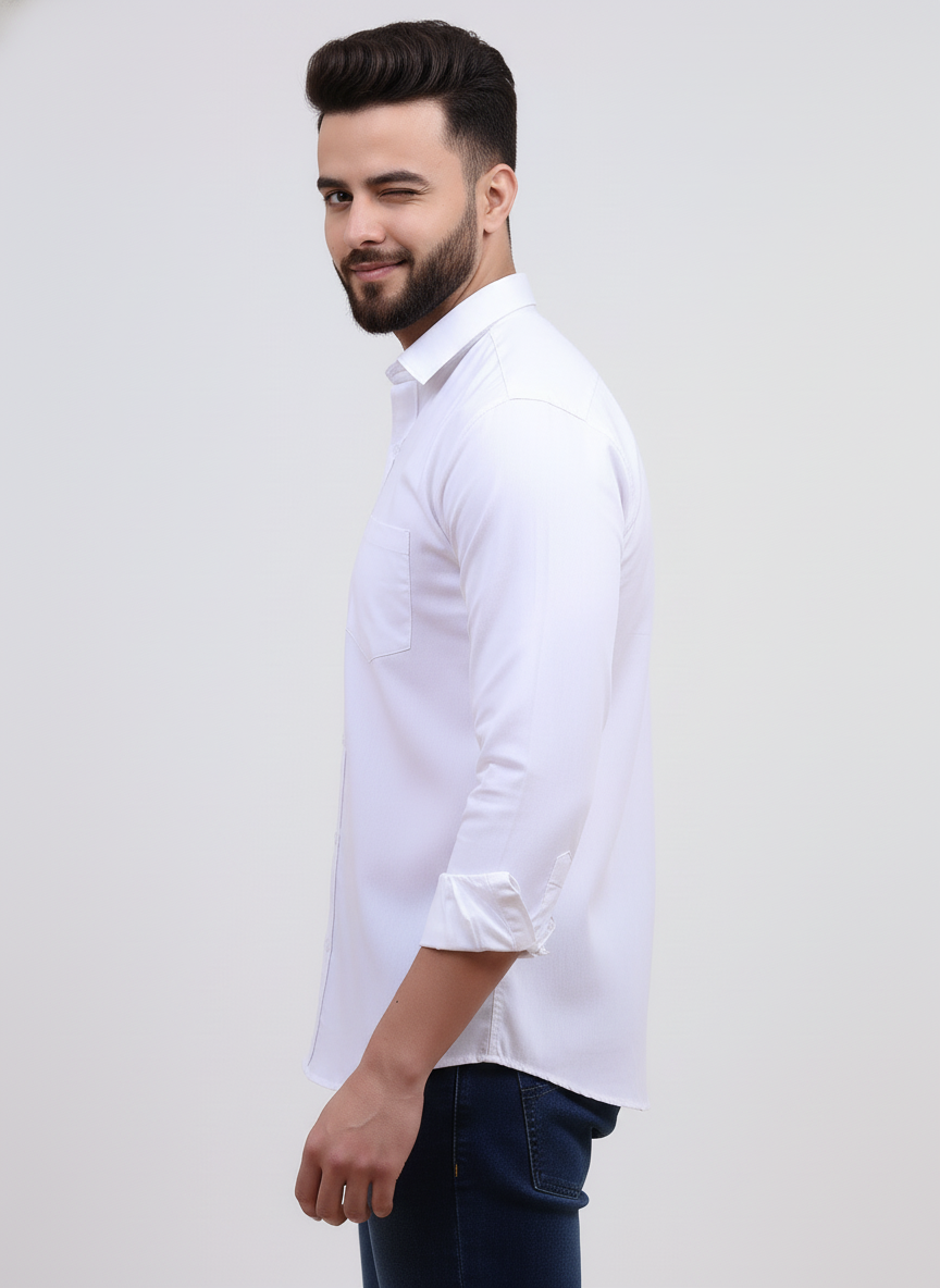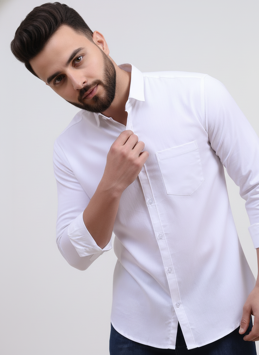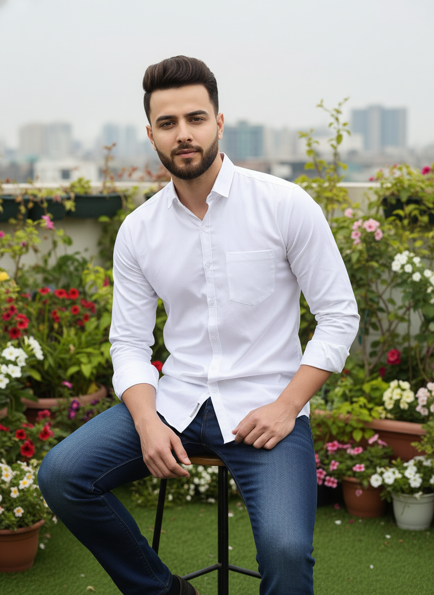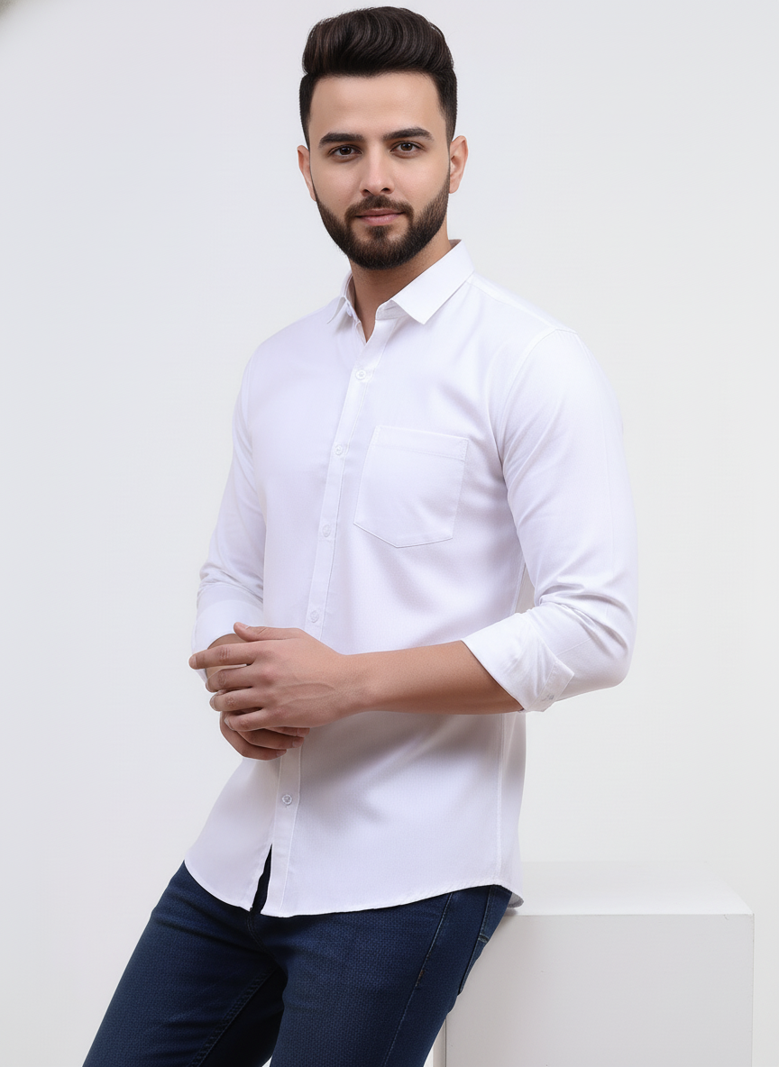 This white shirt for daily wear pairs beautifully with jeans, chinos, or trousers. Also, the fresh white color gives a smart and modern appearance for office, meetings, dinners, and outings. The simple, elegant look makes it suitable for men of all ages.